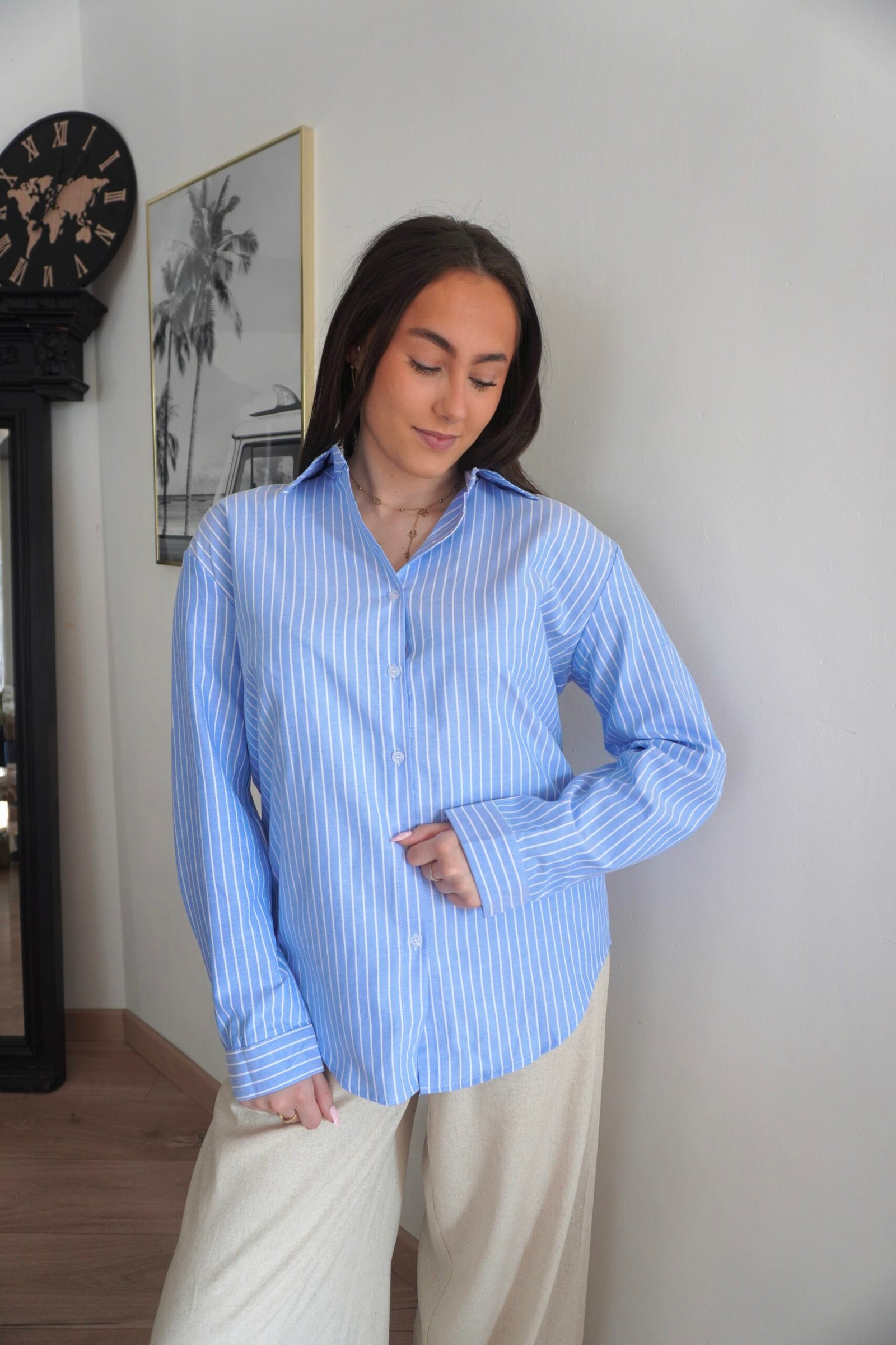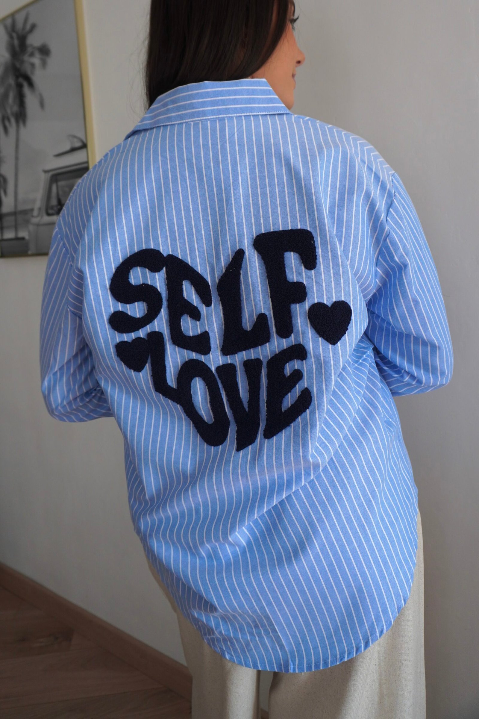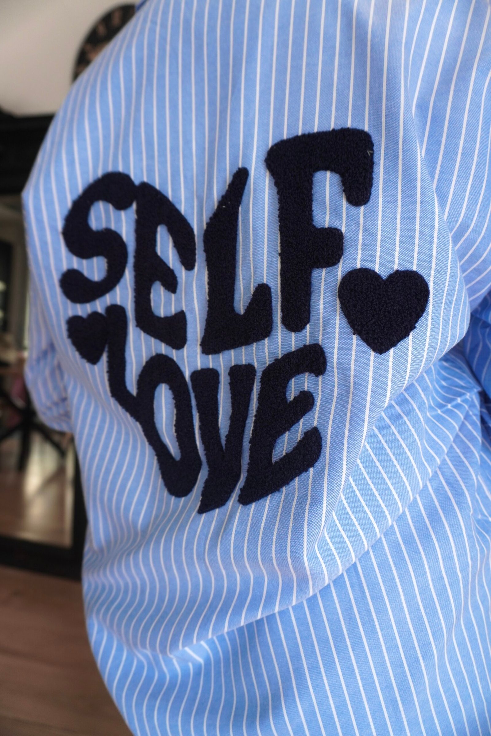 ♡ Chemise bleu à rayure avec écriture brodée dans le dos “SELF LOVE”