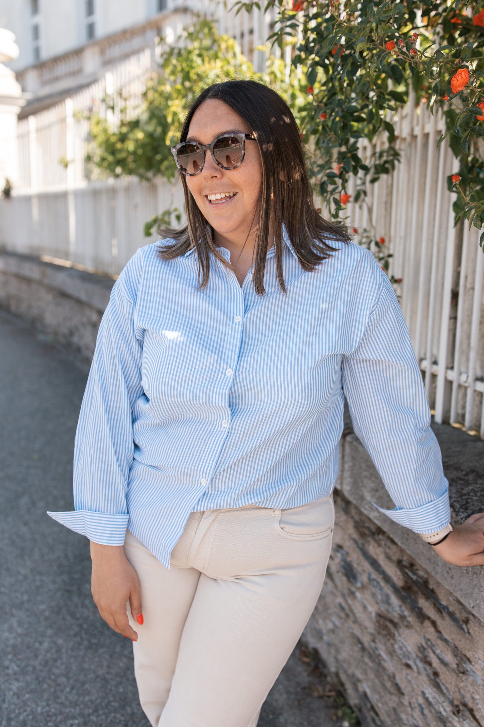 ♡ Chemise avec des rayures blanches et bleues. Un coeur dos nu est dans le dos avec une bordure rouge et blanche