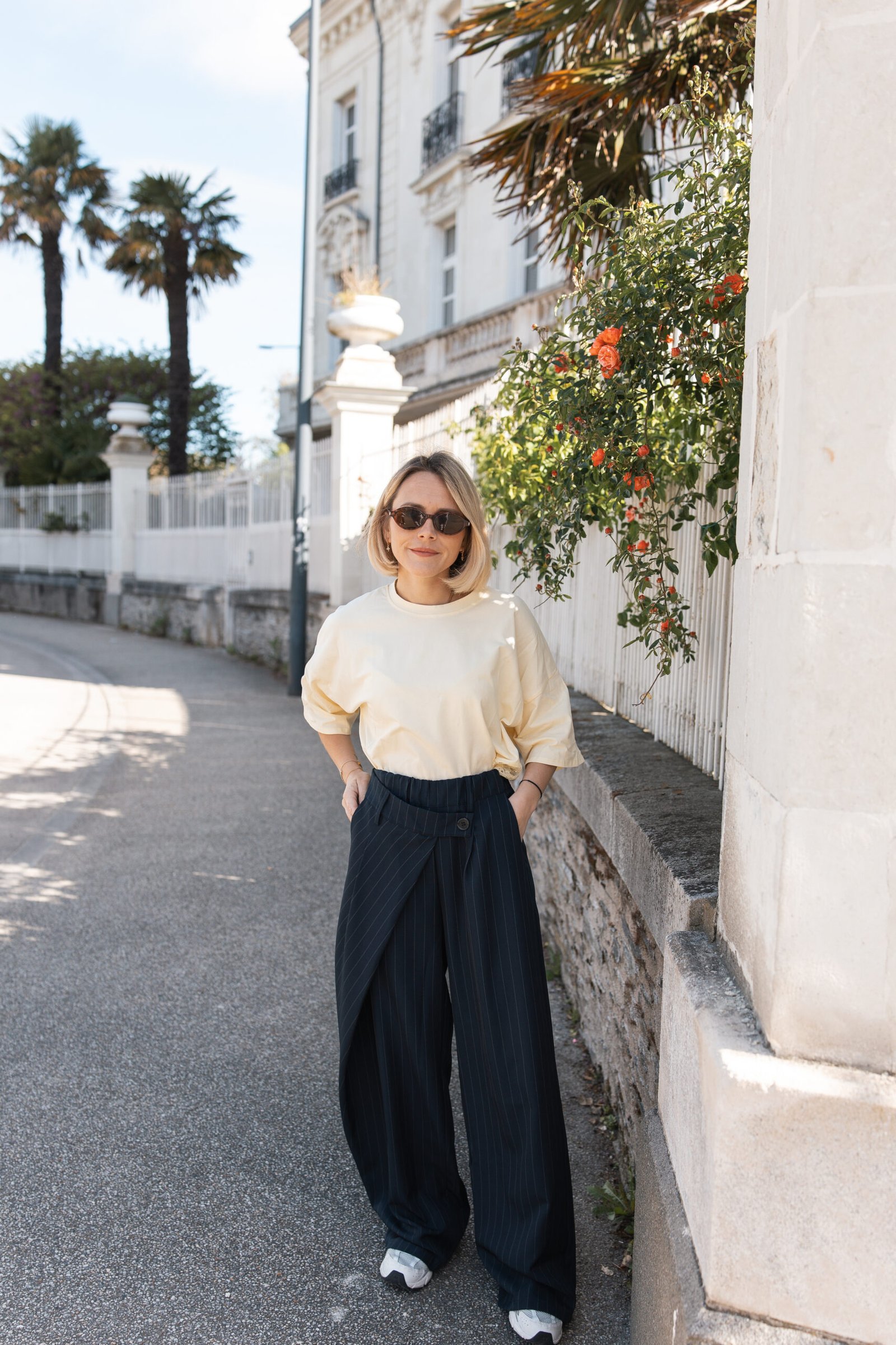 ♡ Pantalon bleu à rayure et bouton asymétrique