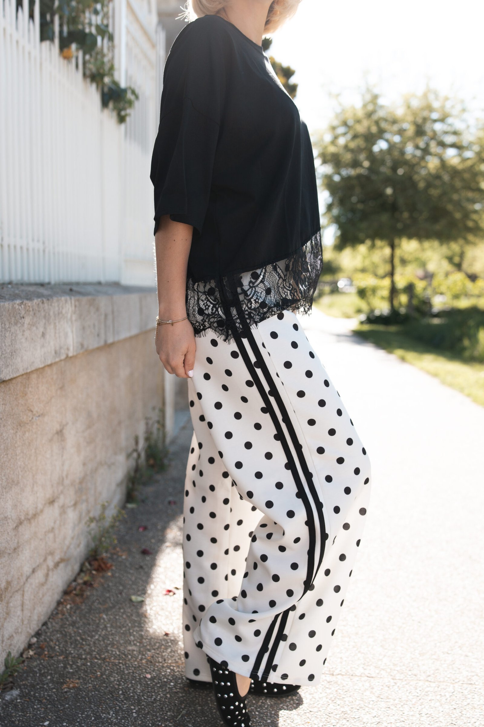 ♡ Pantalon blanc à pois avec 2 liserais noirs sur les cotés. Un élastique se trouve au niveau de la taille, il peut être resserrer à l’aide d’un cordon.
