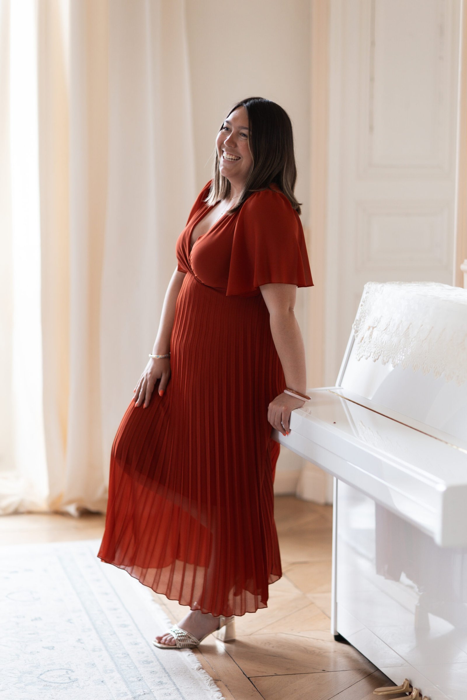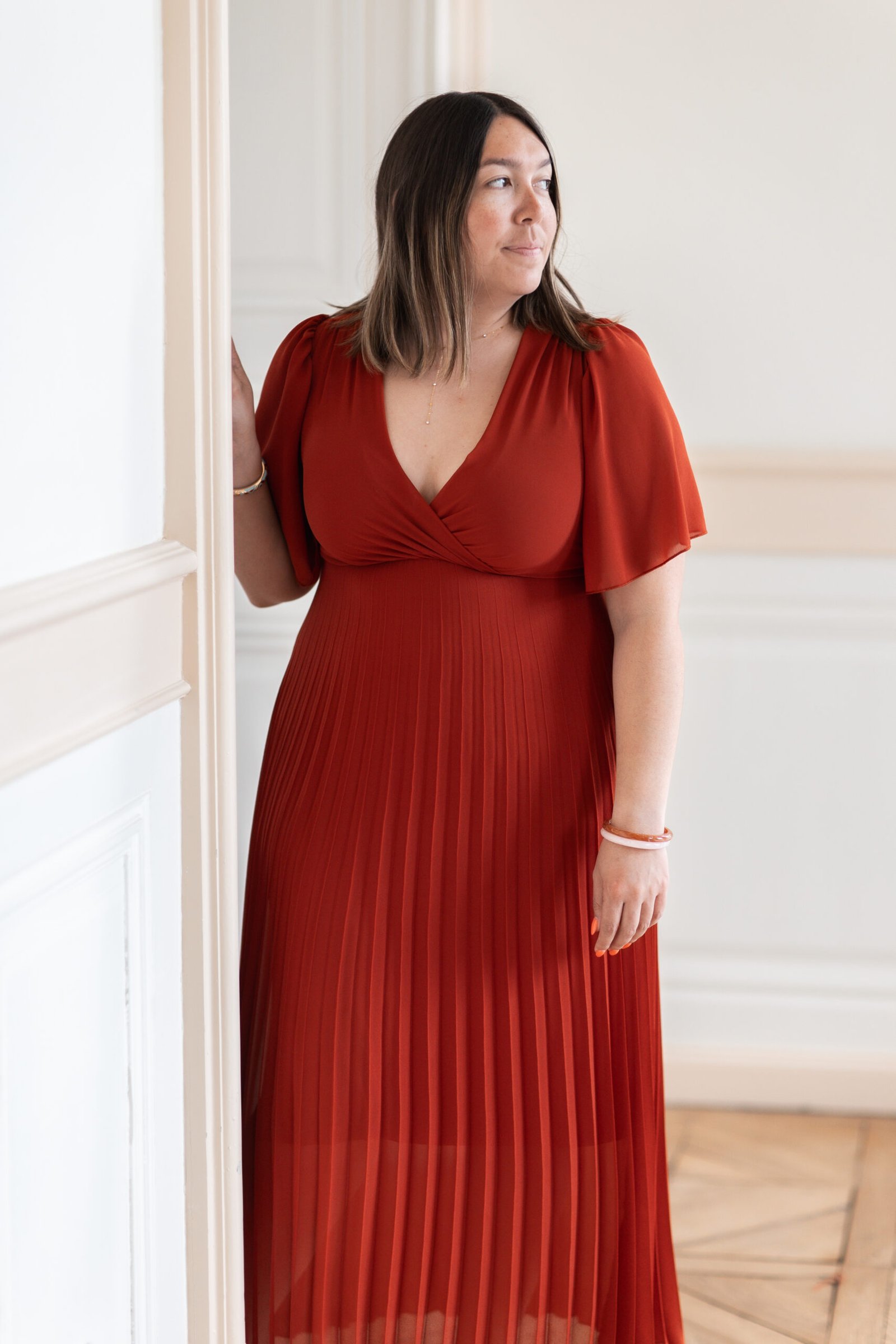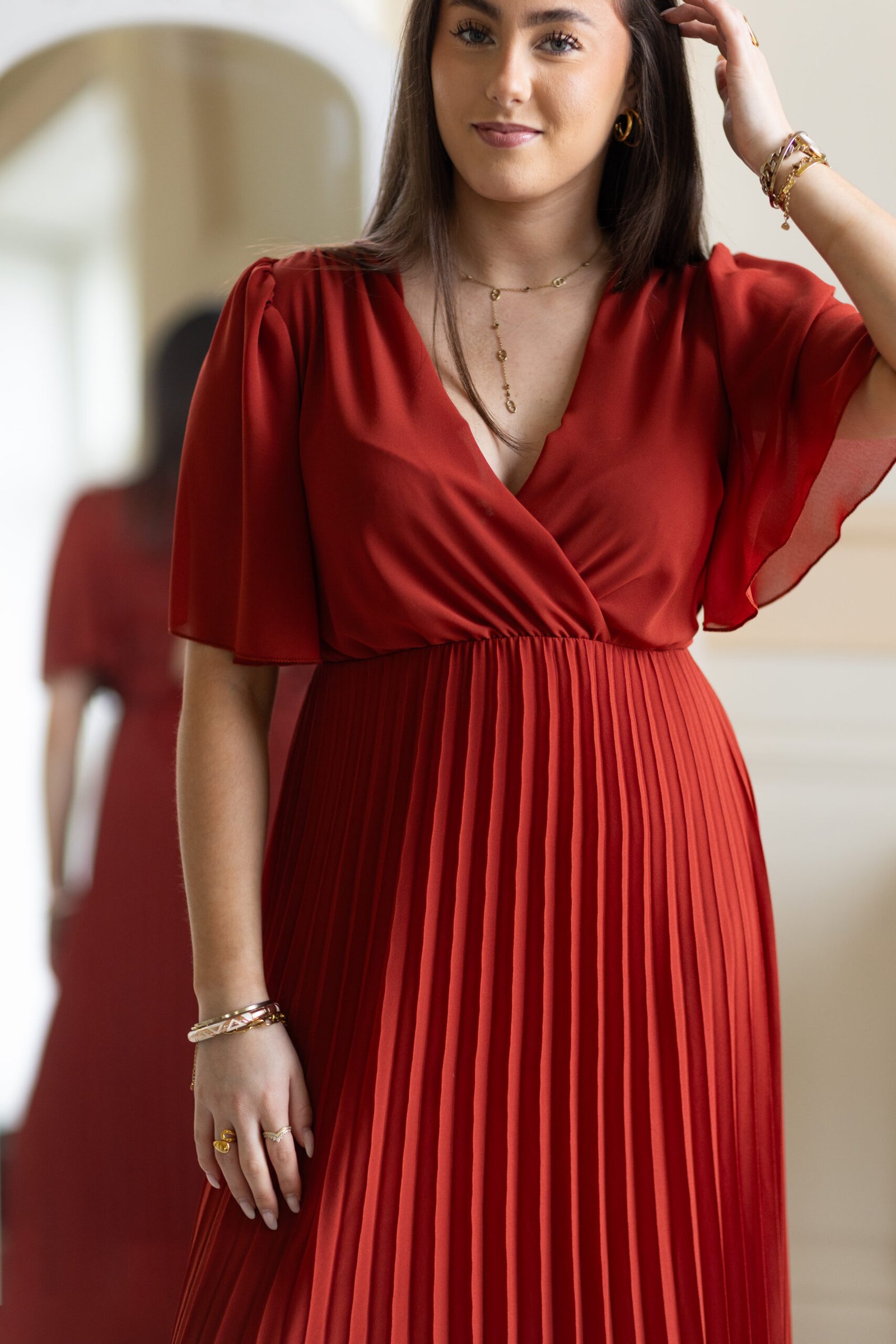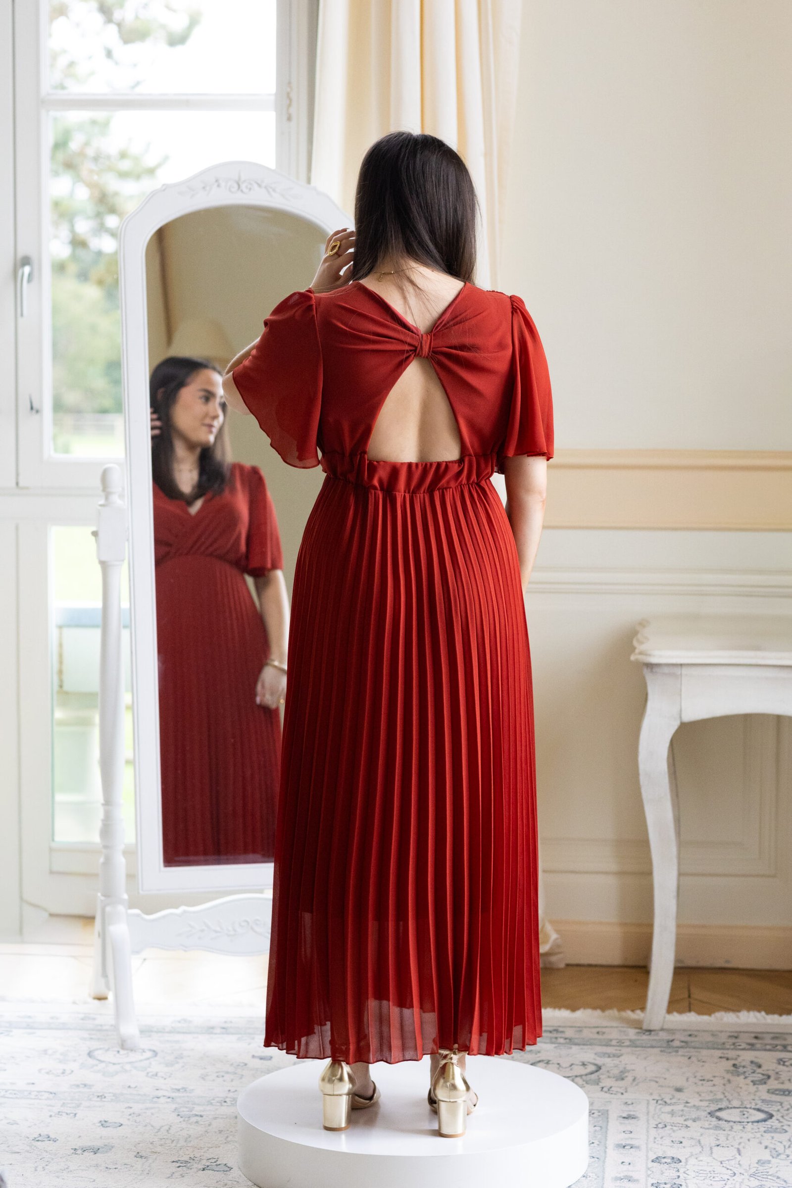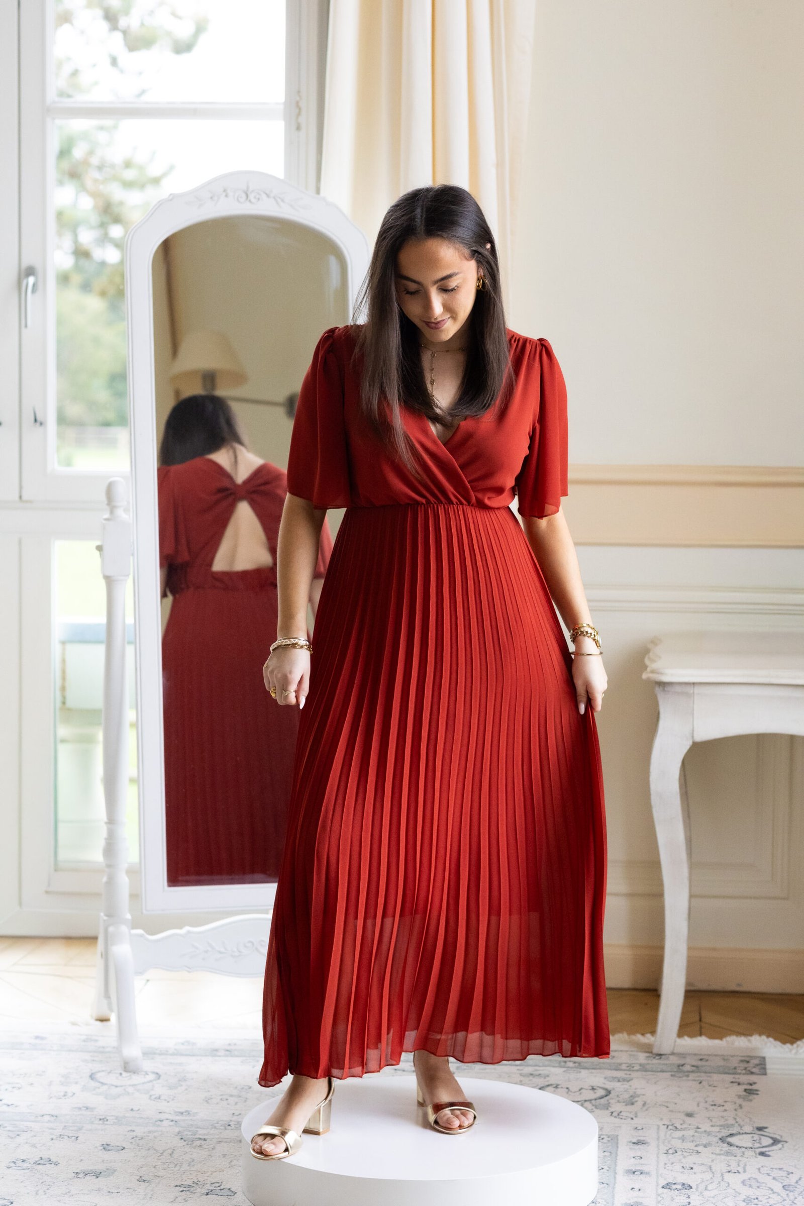 ♡ Robe longue plissée à manches courtes terracotta avec un noeud dans le dos. Elle est doublée au niveau du bas pour éviter la transparence.